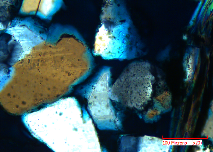 The primary tool of thin section petrography is point counting: the rock is described in great detail at a large number of (representative or random) points and statistical techniques used to analyse the resultant information. As can be seen from the above image, what we think of as a rock at the visible scale is a highly heterogeneous mixture of particles, interstitial clays and cements, and pore spaces. Their relative composition, structure, inter-relationships and history are all important in determining how the rock will behave. What information is important will vary depending on the application: a sample of concrete taken from a built structure will be examined to determine the likelihood of catastrophic failure whereas an oil-bearing rock is f interest for the amount of oil it contains (porosity and saturation) and the ease with which the oil can be extracted (permeability).